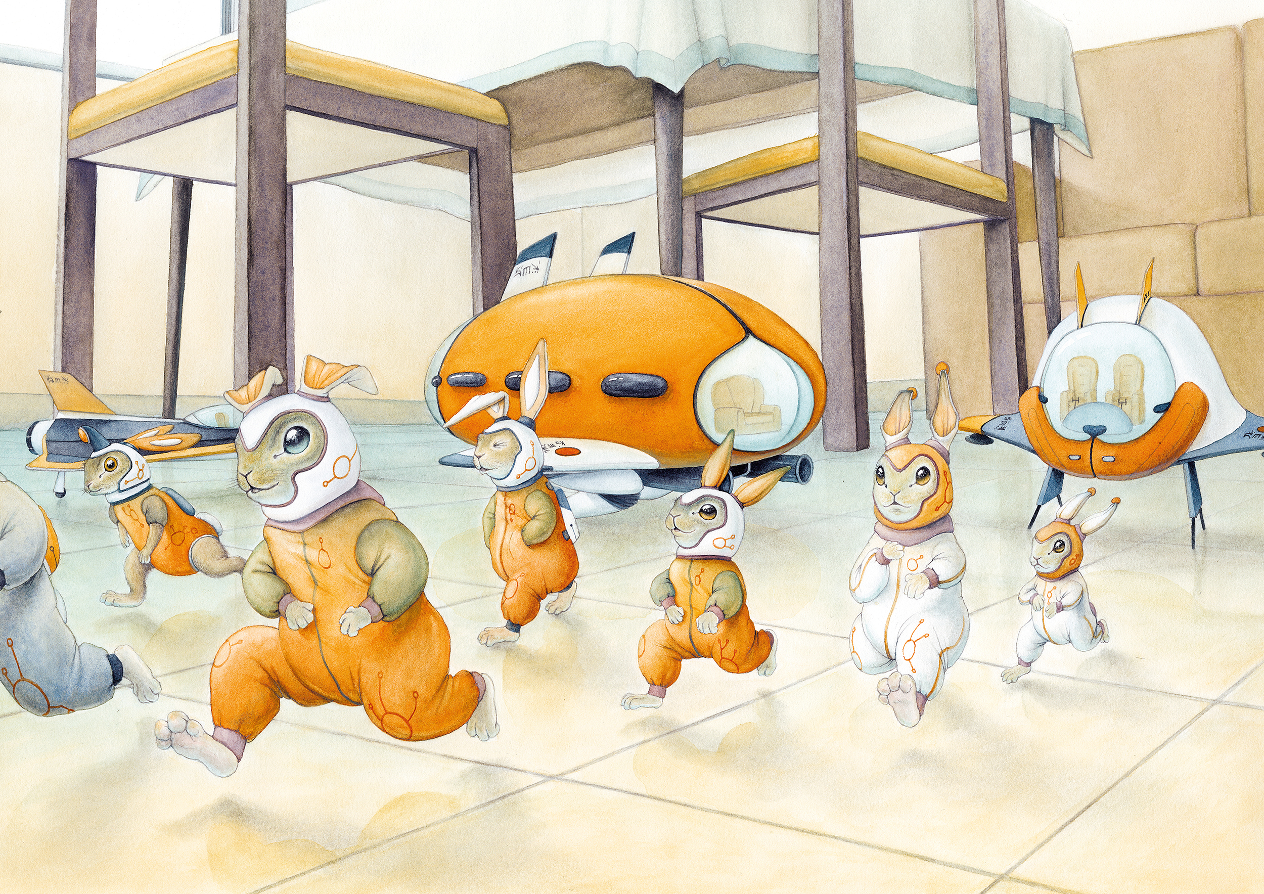 Faites attention, cet album est une incroyable machine attendrissante ! Un dimanche matin comme un autre, débarquent par la fenêtre trois petits vaisseaux spatiaux, à peine plus grands que des jouets. En sortent une joyeuse compagnie de minilapins, des admirables navigateurs lagomorphes pas plus grands que des souris. Ils sont à la recherche urgente de jus d'orange. Commence alors une formidable journée passée en compagnie de ces drôles de personnages. Cet album, écrit et dessiné par l'Italien Alessio Alcini, est absolument remarquable. L'histoire est totalement à hauteur des jeux et de l'imaginaire enfantins : les vaisseaux en forme de presse-agrumes conduits par des lapins en tenue de pilote sont trop craquants ! L'illustration est extrêmement douce et c'est un plaisir de se plonger et de découvrir les multiples détails des dessins. Le travail sur les couleurs – avec des tonalités orange – participent également à cette ambiance un peu hors du temps.